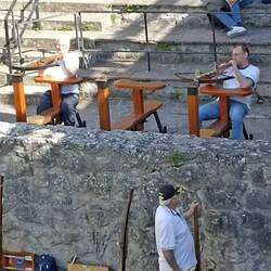 They were having a contest. A tiny target 50 meters away. They hit the bullseye almost every time. I was so lucky to see it. 30 minutes later they had packed up and gone.