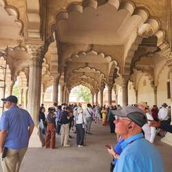 Agra Fort, a UNESCO site, is located next to the Yamuna River, adjacent to the even more famous Taj Mahal. Built on 92 acres, this powerful walled city fortress of red sandstone encloses the once imperial city of the Mughal rulers. We entered through the Delhi Gate, considered the grandest of its four gates, and a masterpiece of the time. We enjoyed about two hours here.