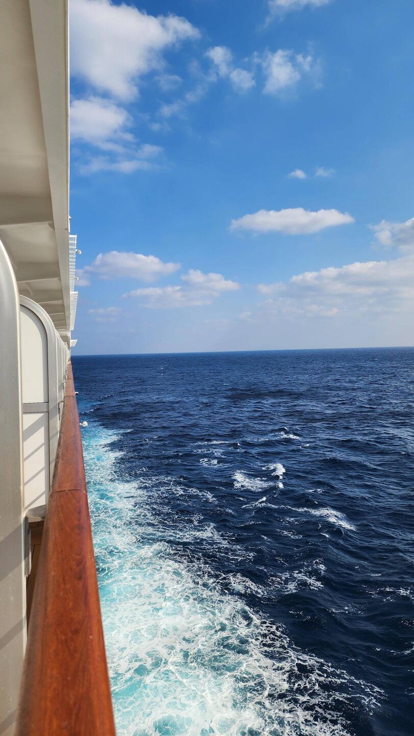 The weather has finally turned warmer and I am out on our balcony drinking in the sounds of sailing through the magnificent ocean, smelling the fragrance...and standing in shorts and a long sleeve teeshirtLæs mere