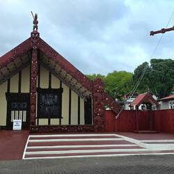 En face de l'église, nous trouvons Te Papaiouru Marae, un lieu de rassemblement maori historique, caractérisé par sa maison de réunion (wharenui) magnifiquement sculptée.