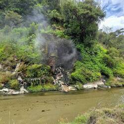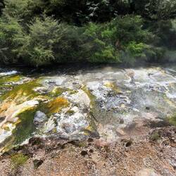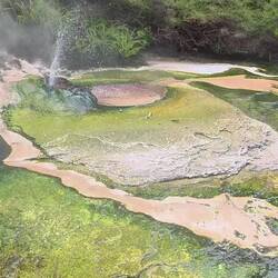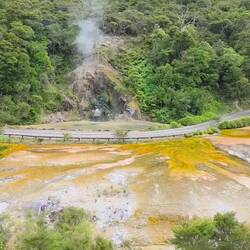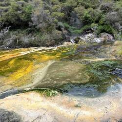 Bien que la silice pure soit blanche, les terrasses de Waimangu présentent des couleurs orange et blanche, souvent aidées par la croissance d'algues et de bactéries thermophiles qui prospèrent dans différentes zones de température.Read more