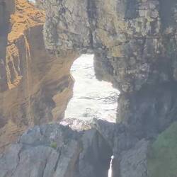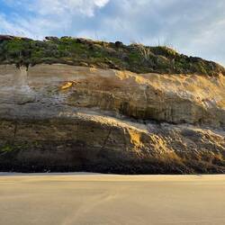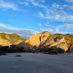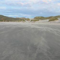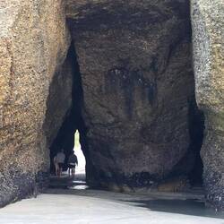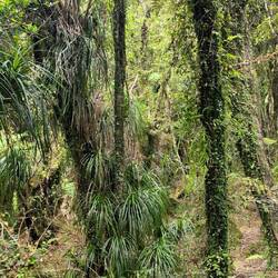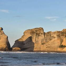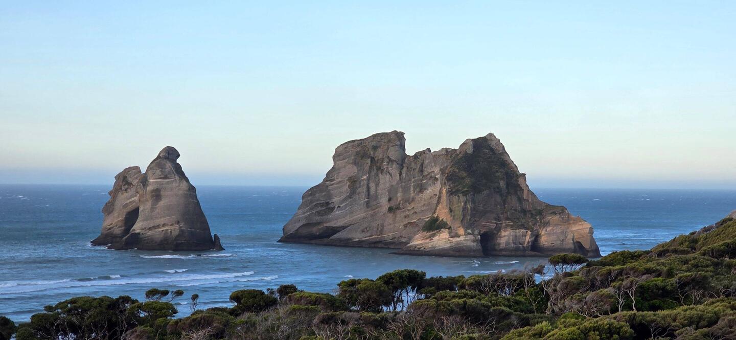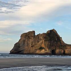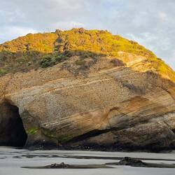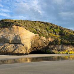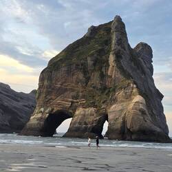 Le soir nous partons pour la plage de Wharariki par un sentier qui traverse des pâturages et une portion de forêt côtière, puis descend vers la plage.