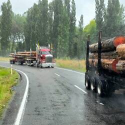 et passons le lac de Tutira caché par la brume. Le trafic est essentiellement du transport de bois en direction du port de Napier.