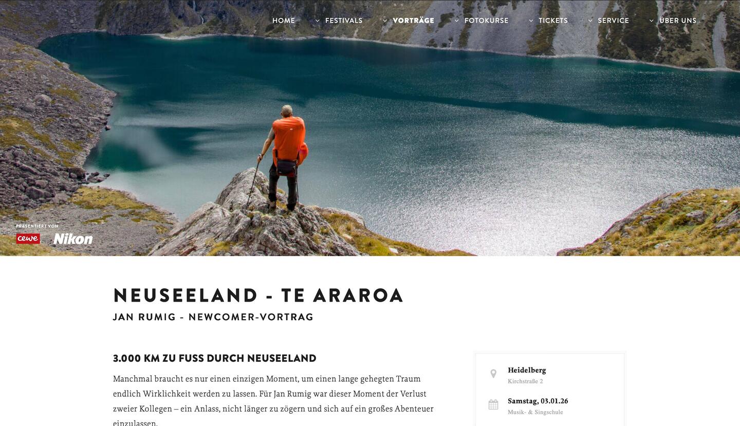 Am 03.01.2026 ist es soweit, ich darf meine Multivisionsshow "Te Araroa" auf dem Wunderwelten-Festival in Heidelberg zeigen. Riesige Leinwand vor großem Publikum.