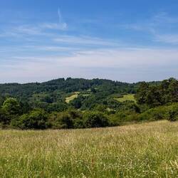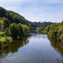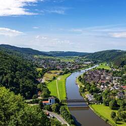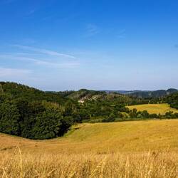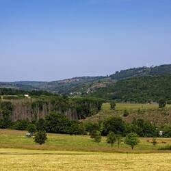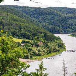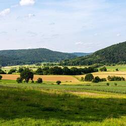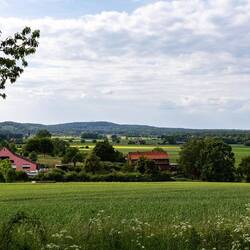 Die ersten Kilometer gibt es schöne Aussichten ins Wesertal. Heute wird es heiß, das heißt viel Schwitzen. Bevor ich wieder in den Wald komme, sehe ich auf dem Weg einen jungen Specht, der scheinbar aus dem Netz gefallen ist. Überall sägen Leute im Wald, um Holz für den Winter zu bekommen. Einer dieser Holzarbeiter spricht mich an, wo ich entlang wandere. Wenig später liegen die Beine eines Rehs auf dem Weg. Wer die wohl hat liegen lassen?!