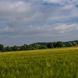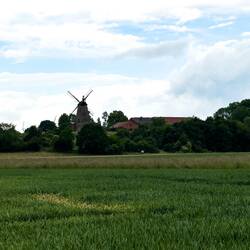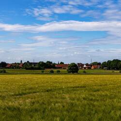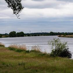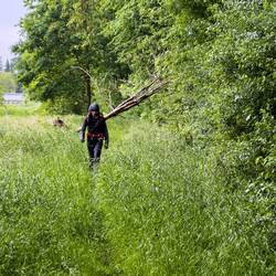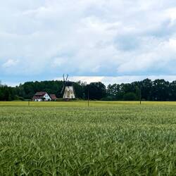 Bei Kleinenheerse machen wir ausgiebig Pause. Ein Haus weiter spricht uns ein Bewohner an, ob hier ein Wanderweg vorbei läuft, in letzter Zeit seien hier immer mal wieder Wanderer vorbei. Natürlich kläre ich ihn gerne auf. Bei Ovenstädt führt der Weg vorbei an einigen schönen Seen. Nun heißt es direkter Kurs nach Petershagen. Führt der Weg hier wirklich geradeaus? Tatsächlich, der schmale Weg ist nicht oft begangen, das vom Regen nasse, hüfthohe Gras wächst überall. Wir mitten durch, 😊 natürlich streifen wir dabei das ganze Wasser ab, die halbwegs trockene Kleidung ist wieder durch. 😜 Evtl. nehmen wir auch noch ein paar Zecken mit.
