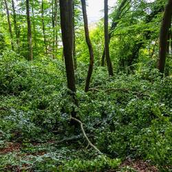 Nach dem Rhein-Weser-Turm ist plötzlich der offizielle Weg durch eine Plane versperrt: Baumfällarbeiten! Aber keine Umleitung, ich weiß nicht, wie lange der Abschnitt ist etc. Hilft nichts, ich gehe durch. Tatsächlich wird ein gutes Stück später auch fleißig gesägt und gefällt. Aber ich kam unbemerkt und heil durch. Glück gehabt!