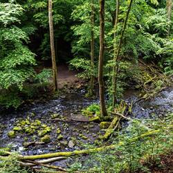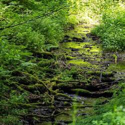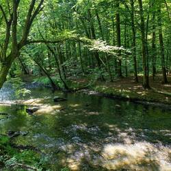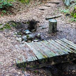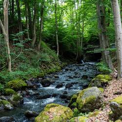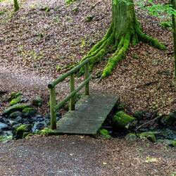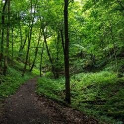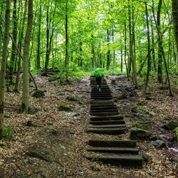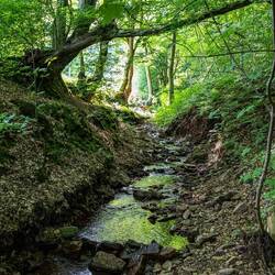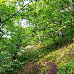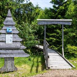 Nach Limbach komme ich an einem historischen Schieferbergwerk vorbei. Und man kann sogar einige Stufen in den Schacht absteigen, spannend. Weniger spannend aber mehr kniequälend sind die unzähligen Stufen hinab Großen Nister. Die nächsten Kilometer verlaufen meist parallel zur Nister. Ein sehr schöner Abschnitt in herrlicher Natur. Besonders lohnenswert ist dabei der Weltende-Pfad. Wenn man da nicht aufpasst, kann es der Wanderende-Pfad werden. Bei mir ist es eher der Kräfteende-Pfad. 😜 Und an dessen Ende geht es dann nochmal ziemlich steil hoch.
