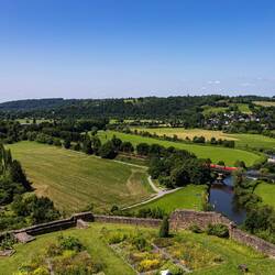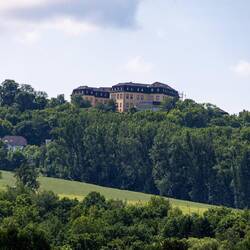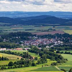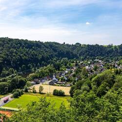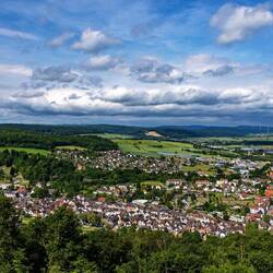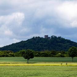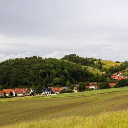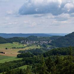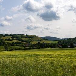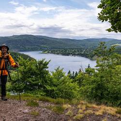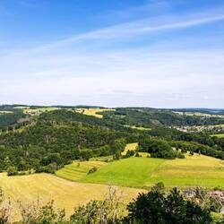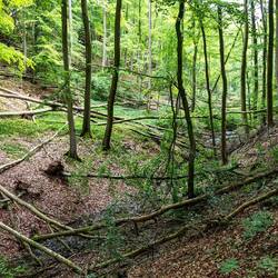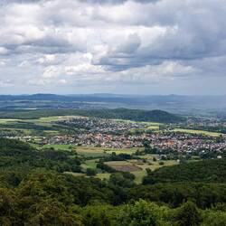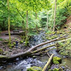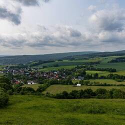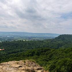 Unsere Wasservorräte füllen wir an der Iborn-Quelle. Von dort verläuft der Weg entlang des hübschen Höllenbachs. Zahlreiche Bäume liegen quer über das Tal eine mystische Stimmung. Immer wieder riechen wir Knoblauch, auch gestern schon, verursacht von altem Bärlauch. Vom Tal kämpfen wir uns hinauf nach Langenfeld. In der Nähe der Schillat-Höhle treffen wir einen Mann, der gestern Bald Head getroffen hat. Er „warnt“ uns vor den zahlreichen Treppen hinauf auf den Hohenstein. Und tatsächlich, der Aufstieg brennt bald in den Beinen. Aber oben wird man von einem genialen Blick belohnt. Bester Spot bisher auf dem Weserberglandweg.