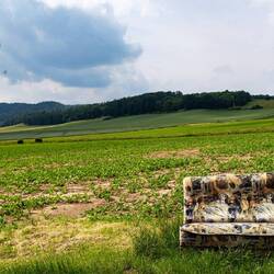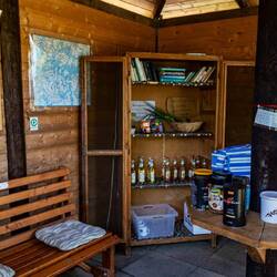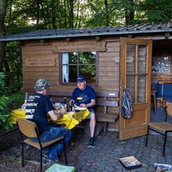 Heute sind aufgrund des Feiertags zahlreiche andere Wanderer unterwegs, ich komme kaum aus dem Grüßen raus. Oberhalb von Süchterscheid lockt mich die Wanderlaube am Biohof: gegen eine Spende kann man sich hier ein Getränk oder Kaffee nehmen. Das nutze ich natürlich gleich.