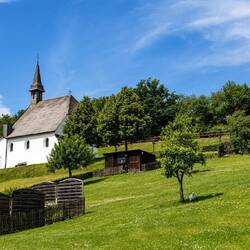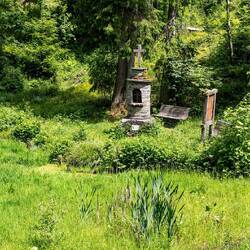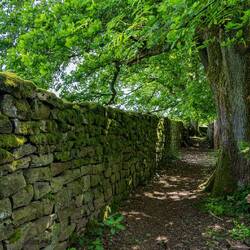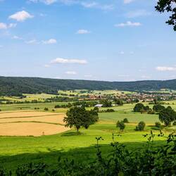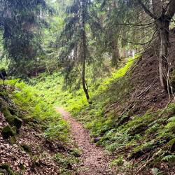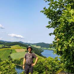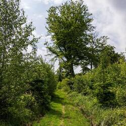 Der Trail verläuft ähnlich schön wie gestern, rauf und runter, aber die Steigungen sind meist angenehm und nicht zu steil. Die Sonne brennt ganz schön runter und sorgt selbst bei angenehmen Steigungen für ordentlich Schweißfluss. Deshalb lege ich in Merten am Friedhof eine kurze Wasser- und Wrappause ein.
