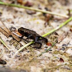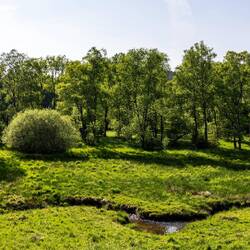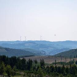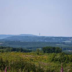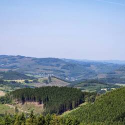 Zu Beginn kommen mir dann doch einige Rothaarsteig-Wanderer entgegen. Plötzlich vernehme ich aus dem Augenwinkel eine Bewegung: eine Rehmutter steht mit dem Kitz nicht weit vom Weg entfernt. Leider stark verdeckt von Bewuchs. Durch die fehlenden Bäume hat man oft hübsche Ausblicke auf den Rothaarkamm. Leider fehlt dadurch auch Schatten. Umso besser, dass ich an 1-2 Quellen vorbei kommen, um kühles Wasser zu bekommen.