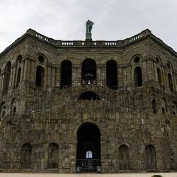 In Barkhausen plündern wir noch mal den Bäcker, bevor wir den Anstieg Richtung Wittekindsberg angehen. Irgendjemand hatte leider entschieden, einige Bäume zu fällen und diese quer über den Pfad liegen zu lassen. Also erst mal über Äste und Stämme klettern. Nach dem steilen Anstieg verläuft der Weg auf dem Grat zum Denkmal. Alle paar Minuten grüßen wir eine andere Vatertagsgruppe mit lauter Musik und Alkohol im Blut. Am Denkmal kommt die Sonne raus und wir haben herrliche Aussichten zurück auf die vergangenen Tage und voraus entlang des Wesergebirges.