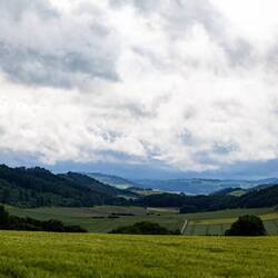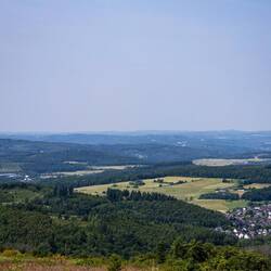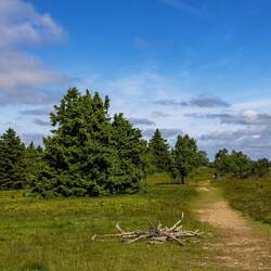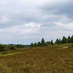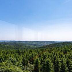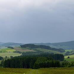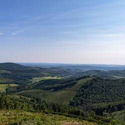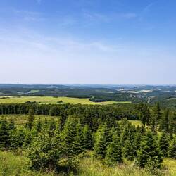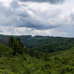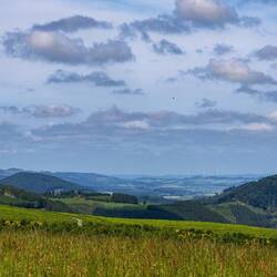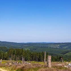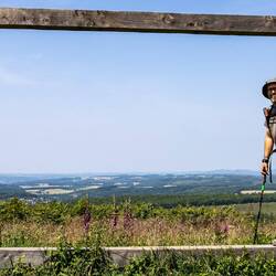Der Weg führt an vier Quellen vorbei. Ich trinke daher von Anfang an wie ein Kamel. An jeder Quelle eine Flasche leer und gleich wieder auffüllen. Nach der Ilsequelle führt der Weg immer am Kamm entlang. Da es die meiste Zeit keinen Wald mehr gibt, habe ich in beide Richtungen grandiose Aussichten. Bis zur Tiefenrother Höhe laufe ich direkt auf der Grenze der Bundesländer NRW und Hessen, bevor ich wieder nach Hessen wechsle.