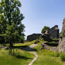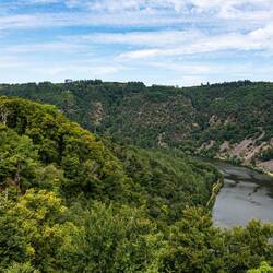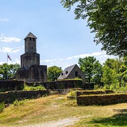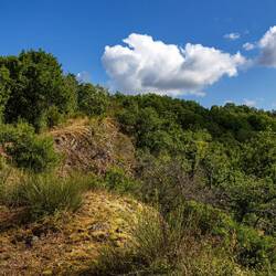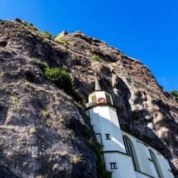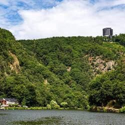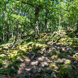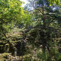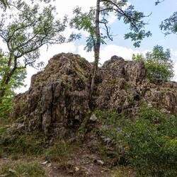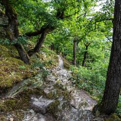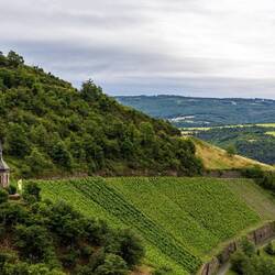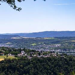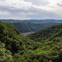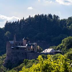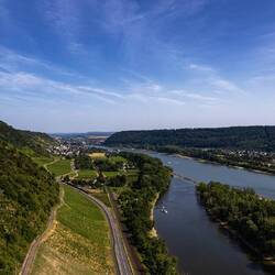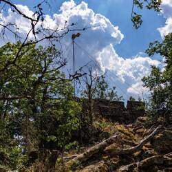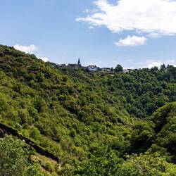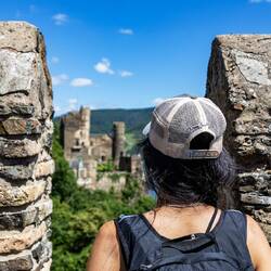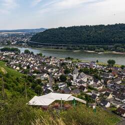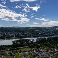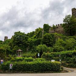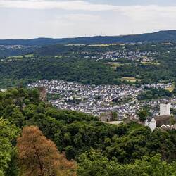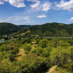 So langsam fängt die Luft richtig an zu glühen. Ich habe schon beobachtet, dass zwischen 15-18 Uhr die heißeste Zeit des Tages ist. Hilft nichts, es geht steil zur Rheinbrohler Ley. Auch hier wieder mega Aussicht. In Hammerstein trinke ich fast das komplette Wasser am Friedhof und versuche, meinen Kopf auf normale Temperatur zu kühlen. Kann ich mir aber sparen, denn es geht gleich wieder aufwärts, zwischen Hammerstein und Leutesdorf versperrt ein riesiger Fels den Weg. Wenn ich eh schon oben bin, mache ich noch einen kleinen Abstecher zur Burgruine, Panorama schauen.