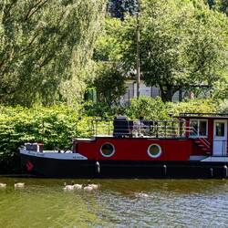 Der Trail verläuft heute die meiste Zeit unter der Einflugschneise des Flughafens. Alle paar Minuten startet eine Maschine, nicht überhörbar. 😊 Bei Wolsdorf trenne ich mich vom Natursteig Sieg. Ein Imbiss zieht mich magisch an. Und dort begehe ich vor Lust einen Fehler: Gyros mit Pommes. Total lecker, aber danach fällt das weiterlaufen schwer. Es geht jetzt immer Richtung Bonn und den Rhein. Die Sieg wird zahmer, ich sehe an manchen Stellen Leute drin baden. Für so ein Verbindungsstück ist der Weg relativ schön.