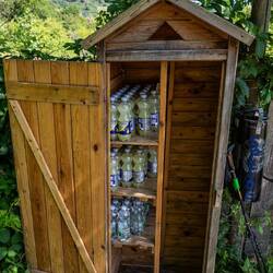 Aufgrund der Hitze nutze ich den ersten Bach, um was zu trinken und neues zu filtern. Oben am Aussichtspunkt, nur einer von wahnsinnig vielen lohnenswerten heute, begegne ich einem Wanderer, der spontan nach einem Zahnarztbesuch ein bisschen wandern will. Ich werde ihn später an meinem Nachtquartier noch mal treffen. Am Wegesrand komme ich an einem Getränkeregal vorbei, an dem man sich gegen eine Spende ein Getränk nehmen kann. Ich nutze auch diese Gelegenheit.