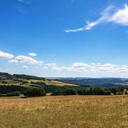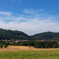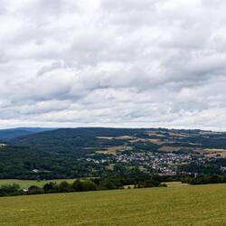 Positiv überrascht war ich von Meisenheim, ein süßes Örtchen mit hübschem Fachwerk. Kurz davor komme ich an Kilometer 2.600 vorbei. Danach laufe ich schon fast heiß, da rettet mir ein Lebensmittelautomat das Leben. Ich trinke zwei Apfelschorle und vertilge ne zu kleine Packung M&Ms. Doch nach dem folgenden Aufstieg ist alles wieder rausgeblasen. Vom Höhenrücken eröffnen sich schöne Blicke auf Unkenbach.