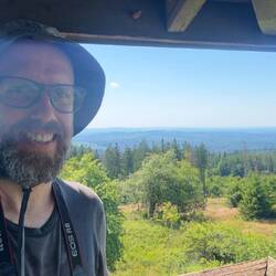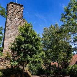 Über die Breiberge geht es Richtung Löwenburg. Hier befolge ich Robins Rat und steige zur Ruine auf. Allerdings nehme ich den direkten Weg über einen Pfad ohne jegliche Kurven. 😊 Beim Abstieg spricht mich Martin an: „Du bist doch JR irgendwie von Find Penguins und gehst gerade den NST.“ So kommen wir kurz ins Gespräch. Danke, Martin, war schön, euch kennenzulernen. Für mich geht es erst mal zum Löwenburger Hof auf Weizen und Kuchen. Die steilsten Anstiege sind damit durch. Was mich zuversichtlich stimmt: mein Körper hat sich bis auf die Hitze null beschwert heute, die Beine sind bereit für weitere Höhenmeter in den kommenden Tagen.