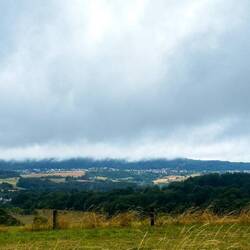 Da der Schaumberg heute Morgen selbst noch in den Wolken hängt, bleibe ich auf dem Panoramaweg. Ansonsten hätte ich die zusätzlichen Meter auf das Plateau gemacht. Aber wenn ich den Turm nicht sehe, habe ich auch keine Sicht vom Turm. Dafür habe ich im Wald mystische Stimmung. Teilweise hängt der Nebel in den Bäumen, gespenstisch. Unterhalb des Ohlenkopfs öffnen sich dann die Schleusen. Der Regen startet. Über Bergweiler hinweg erblicke ich das Kunstwerk „Wortsegel“ auf der Anhöhe gegenüber.