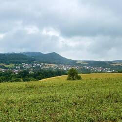 Meine Wrapspause mache ich unten in Obermoschel. Gut so. Steil führt der Weg hinauf zur Burg Landsberg. Von da dann in Wellen Richtung Stahlberg. Am Weidelbacherhof kann ich noch mal Energietanken. Hier gibt es eine Wanderstation mit Vertrauenskasse. Perfekter Ort. Ich habe zwei Radler alkoholfrei und ein Eis. Ich bin bereit für den finalen Aufstieg auf den Stahlberg. Anschließend geht es mit hübschen Aussichten auf den Donnersberg nach Rockenhausen.