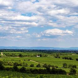 Am deutschen Weintor in Bockenheim machen wir gediegene Mittagspause im Café am See. Das Weintor markiert das nördliche Ende der Weinstraße. Hier startet der Pfälzer Weinsteig und die Aussichten ändern sich von Getreideanbau zu Weinbergen. Oberhalb von Bockenheim steht am Patricia-Wingert ein Weinstand mit herrlicher Aussicht auf die Rheinebene. Aber Pause hatten wir ja gerade. Unweit davon beende ich Kilometer 2.700. Ab jetzt wird von 1.000 runter gezählt. 😜