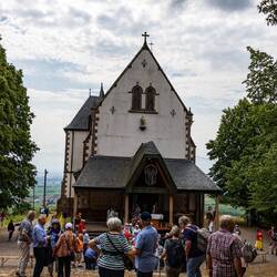 Schon von weitem höre ich, dass an der St. Anna Hütte was los ist. Und tatsächlich stolpere ich in die Wallfahrt. Da ist hier oben einiges los. (https://www.annakapelle.de/wallfahrt.html) Zum Einkehren ist mir zu viel los. Ich genieße die absolut geniale Aussicht von der Kapelle und gehe weiter. Wenig später zweigt der NST vom Pfälzer Weinsteig ab, um der Walddusche in Gleisweiler die Ehre zu erweisen. Ich wähle die andere Variante und bleibe auf dem Weinsteig.