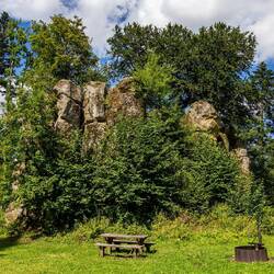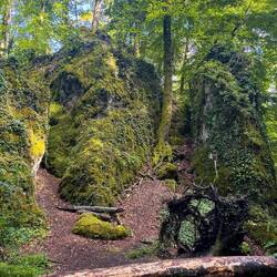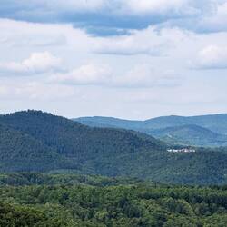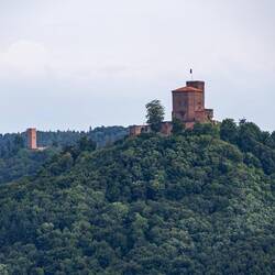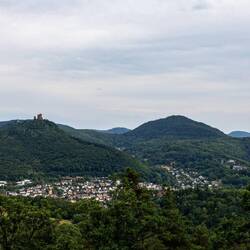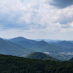 Beide Varianten vereinen sich wieder an der Landauer Hütte. Einmal um den Orensberg führt der Weg zum Orensfels. Dieser Fels ist ein absolutes Muss im Pfälzer Wald, er bietet eine Aussicht auf das Dreigestirn von Burg Trifels, Anebos und Scharfenberg. Alle drei werde ich morgen passieren.