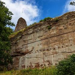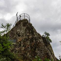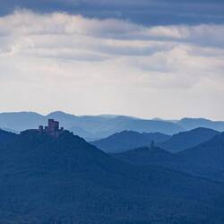 Vorausschauend habe ich die Öffnungszeiten der Burg Trifels nachgesehen, so spare ich mir einen unnötigen Anstieg ganz zum Sonnenberg rauf. Dieser wird heute Morgen seinem Namen gerecht, er wird in schönes Sonnenlicht getaucht. Vom Naturfreundehaus war es ein ordentlicher Anstieg, der sich weiter fortsetzt. Da ich mich hier auskenne, mache ich noch einen kleinen Schlenker zum Anebosfels, da von dort der Blick auf die Burg Trifels genial ist. In der Nähe befindet sich auch ein Aussichtspunkt mit Blick auf Fensterfels, Münzfels und Scharfenberg.