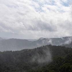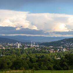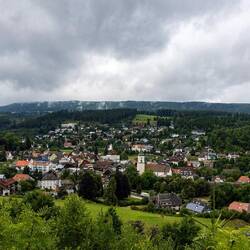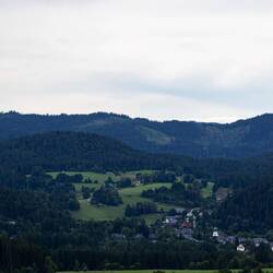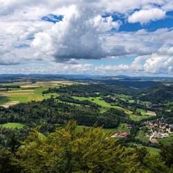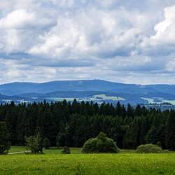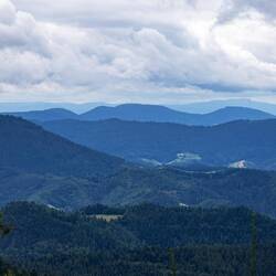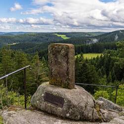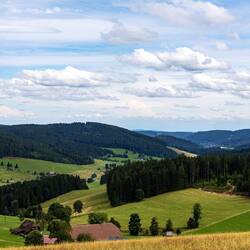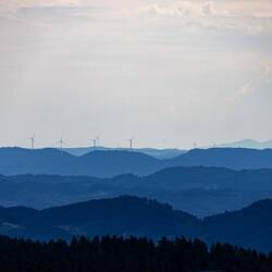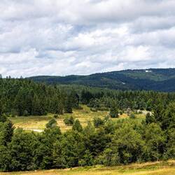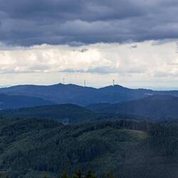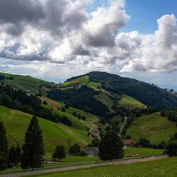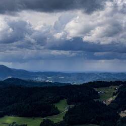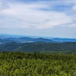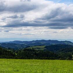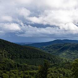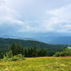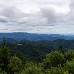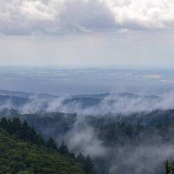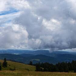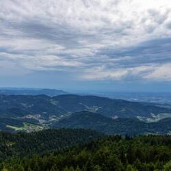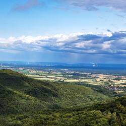 Inzwischen laufe ich viel auf breiten Forstwegen ohne große Abwechslung. Ab und zu bieten sich Ausblicke Richtung Rheinebene. Der Himmel möchte mein Gemüt erhellen, es zeigt sich immer mehr Sonne. Ich hadere mit mir: wenn ich mich jetzt eincreme, dann ändert sich das Wetter wieder. Und tatsächlich: irgendwann höre ich Donner, über mir ist der Himmel aber immer noch strahlend blau. Am nächsten Aussichtspunkt sehe ich eine Gewitterfront oberhalb von Oppenau.