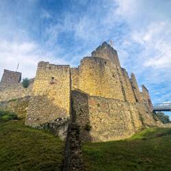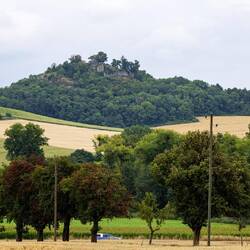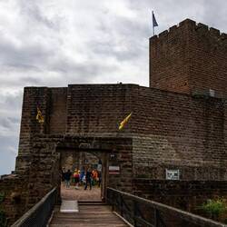Berauscht von dieser Natur geht es rüber zur Burgruine Neukastel. Die Sicht auf die Rheinebene ist genial. Gerade als ich die beachtliche Madenburg erreiche, fängt es an zu regnen. Erfreulicherweise nur leicht. Leider ist die Burg noch geschlossen. Als ich die Burg Landeck erreiche, stoppt der Regen. Zeit für Weizen und Kuchen. Leider fängt es gleich wieder an. Als ich die Burg verlasse, kommt mir ein Mann entgegen. Auf meinem Hinweg tummeln sich gerade zahlreiche Wildschweine, deshalb ist er auf die Straße ausgewichen. 🐗 Ich überlege, ob ich mal nachsehen soll, aber das ist mir dann doch zu riskant.