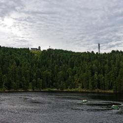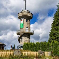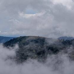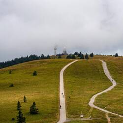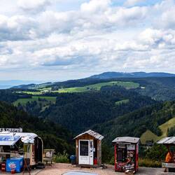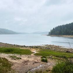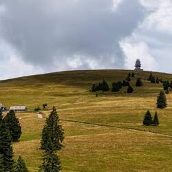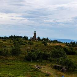 Am Bahnhof Forbach wartet Patricia, eine Freundin von mir, die mich die restliche Strecke zum Mummelsee begleitet. Nach ner kurzen Pause beim Bäcker geht’s los. Und gleich richtig. Der Aufstieg zur Wegscheid-Hütte hat es in sich. Und wie soll es anders sein, danach geht es runter zur Schwarzenbach-Talsperre. Aktuell führt der See relativ wenig Wasser. Kein Wunder, so wenig, wie es die letzte Zeit geregnet hat. Damit wir nicht frieren, geht es noch steiler als zuvor hoch zum Seekopf und dann weiter zur Badener Höhe mit dem Friedrichsturm. Genau diesen Abschnitt bin ich vor ein paar Monaten exakt so gelaufen. Vom Turm sieht man in der Ferne schon das aufziehende Gewitter.