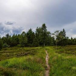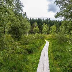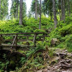 Tatsächlich bin ich bei komplett grauem Himmel gestartet, in allen möglichen Schattierungen. Direkt am Hotel wird das hauseigene Holzofenbrot gebacken. Der Schornstein hat ganz schön geraucht. Ich dachte, die räuchern den Wald. 🤣 Der Weg heute Wasser insgesamt sehr zahm und teilweise monoton zu gehen. Zu Beginn ahne ich noch nichts davon, vorbei am Seibelseckle marschiere ich zur Darmstädter Hütte. Hier durch die Kernzone des Nationalparks führt der schmale Pfad durch sich selbst überlassenen Wald. Vom Wildsee ist aber von hier oben nicht viel zu sehen.