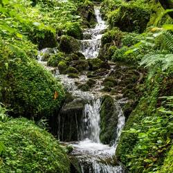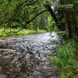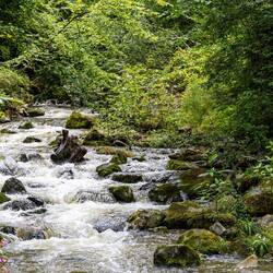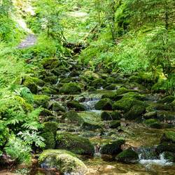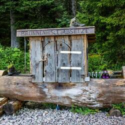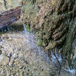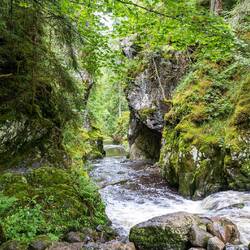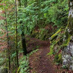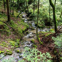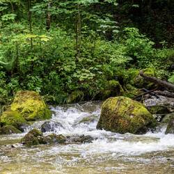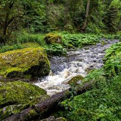 Als wir durch Lindenberg kommen, meldet sich das erste Hungergefühl. Gestern dachte ich noch so, ich kann heute ja in Lindenberg einkaufen. Hier fällt es mir wie Schuppen von den Augen, es ist ja Sonntag. 😱 Ich Dödel. So essen wie auf dem Marktplatz meine letzten beiden Wraps. Für den restlichen Tag bleiben uns noch zwei Müsliriegel. 🙈 Die Hausbachklamm bei Weiler verzaubert uns beide, Hang bekommt vor Staunen den Mund kaum noch zu. Über zig Kilometer laufen wir entlang des Bachs bis hinauf zu dessen Quellgebiet.