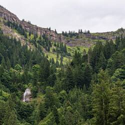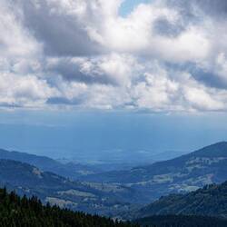 Von da an wird es ernst. Erst an der Talstation der Hochgratbahn hört der Regen auf. Perfekter Zeitpunkt. Auf 3-4 km steigen wir die 1.000 Meter hinauf auf den Gipfel des Hochgrat. Dabei geht es durch die Brunnenau. Zahlreiche Wasserfälle und die Bergflanken verbunden mit dem satten Grün der Bäume und Wiesen sind genial anzuschauen und lenken von den Strapazen ab. Oben weht ein eisiger Wind. Die Sicht ist aber besser als befürchtet. Und sie soll nun Stunde um Stunde besser werden. In der Ferne erblicken wir den Bodensee, wo wir vorgestern noch waren. In der Bergstation nehmen wir ein spätes Mittagessen zu uns.