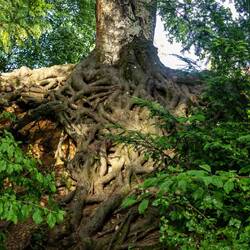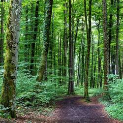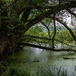 Mit jedem Schritt werden die Berge im Hintergrund kleiner und kleiner. Zuerst laufe ich entlang von Streuobstwiesen, Erdbeerfeldern und Ackerbau. Nach Kapsweyer betrete ich den Bienwald. Darüber hatte ich schon einiges gehört: es kann viele Mücken geben, sehr langweiliger, quadratisch angelegter Wald. Mücken hatte ich nicht viele, dafür aber mal wieder meine geliebten Bremsen. 🤬 Und tatsächlich vermeidet der Weg die breiten Forstwege, sondern führt meist auf Single Trails. Leider sind diese an manchen Stellen total zugewuchert und ich kämpfe mich durch menschenhohen Farn. Auf dem Naturwaldpfad wird es teilweise sogar weglos. Dies liegt scheinbar daran, dass der Weg gesperrt ist, da aufgrund einer Pilzerkrankung die Bäume einfach so umkippen könnten. Leider steht der Hinweis erst am Ende. 🤷♂️