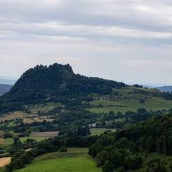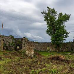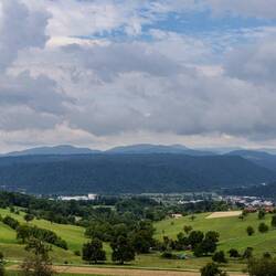 Vom Stäffelsbergturm gibt es eine mystische Stimmung, immer noch wird Regen quer geweht. Irgendwie kommt mir das alles hier bekannt vor, und ja, auch hier war ich schon mal. Ich erinnere mich an den steilen Aufstieg zur Ruine Guttenberg hoch, er hat in der Zwischenzeit leider nicht an Steilheit verloren. Von oben hat man eine herrliche Sicht auf die Vogesen. Darüber sieht das Wetter noch sehr dunkel aus.