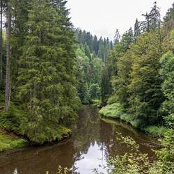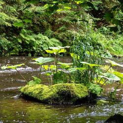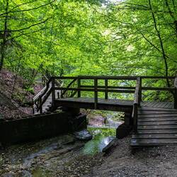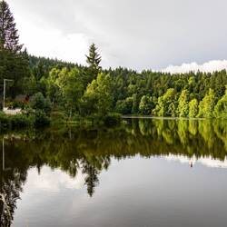 Gleich zu Beginn kommen dazu die unzähligen Kurven hinauf zum Schwalbenfelsen. Mission geschafft: Wanderer komplett nass. Gut, dass es danach erstmal flach weiter geht. Am Triefenbach führt der Weg idyllisch zum Hilschweiher, frei nach „über 7 Brücken musst du gehen“ im steten Wechsel auf der linken oder rechten Seite. Am Hilschweiler kommt kurzes Pragser Wildsee Gefühl auf, auf dem See treiben ein paar Ruderboote, nur die Berge im Hintergrund fehlen. Ich hoffe, mit diesem Vergleich fluten nicht 1.000 Influencer den See. 😜
