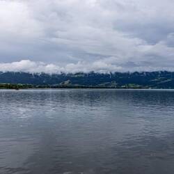 Von der gegenüberliegenden Seeseite ist leider nichts zu sehen. Auch sonst laufen wir einfach so vor uns hin. Auf der Brücke über den Fluss Schussen machen wir hinter Kilometer 3.500 einen Haken. Erst kurz vor Kressbronn hört es auf. Bis dahin sind wir beide komplett durch nass. Ich bin eigentlich bedient. Die letzten Tage haben ordentlich an meiner Laune gedreht. Aber zu zweit motivieren wir uns gegenseitig.