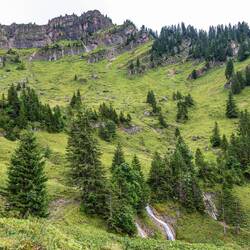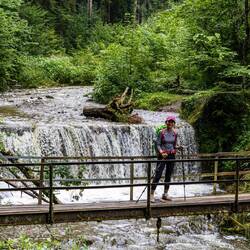 Zum Aufwärmen erklimmen wir zu Beginn den Hündlekopf. Kurz vor der Bergstation queren wir eine Kuhweide. Auch ein paar Pferde gibt es. Die Pferde nähern sich Hang. Und das eine knabbert gleich mal ihre Regenjacke an. Hang konnte diese dem Pferd kaum wieder entreißen. Ein Vorteil hatte der Regen. An den Buchenegger Wasserfällen waren wir alleine. Was für ein wunderbarer Ort.