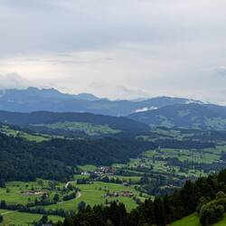 An der Grenze zu Österreich, ein paar Meter gehen sie sogar im Nachbarland, queren wir das hübsche Wildrosenmoor. Den nun einsetzenden Nieselregen ignorieren wir, er prallt förmlich an uns ab. Bis Oberstaufen geht es noch zwei Mal ins Tal und wieder hinauf. Vom letzten Gipfel, Kapf, sehe ich einige Gipfel der Nagelfluhkette. Hier bedauere ich am meisten, dass heute immer noch schlechte Sicht herrscht, die Aussichten in die Bergwelt vermisse ich.