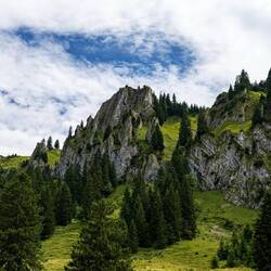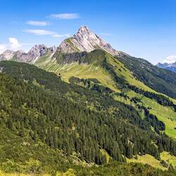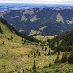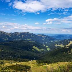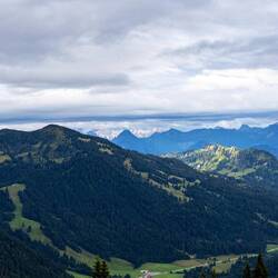 Als ich heute Morgen aus dem Fenster geschaut habe, glaube ich, mich tritt ein Pferd. Wir haben strahlend blauen Himmel. So beschwingt starten wir mit bester Laune. Gleich zu Beginn schrauben bzw. schnauben wir schnurstracks hinauf auf den ersten Gipfel. Durch herrlichen Wald geht es über hübsche Wurzelpfade. Hang findet einige große Steinpilze und Hexenröhrlinge. Natürlich kommen diese stolz ins Gepäck. Vom Hochschelpen genießen wir feinstes Bergpanorama, besonders hervorstechend der Hohe Ifen und der Hochvogel.