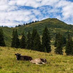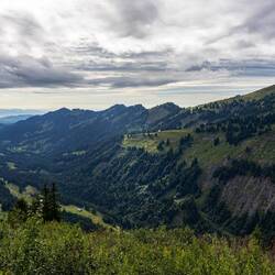 Vorbei an zahlreichen Alpen steigen wir ins Autal ab. Dort verweilen wir nicht lange, es geht gleich wieder steil bergauf auf den Heidenkopf. Jetzt ist die Weitsicht richtig genial und wie kommen aus dem Staunen nicht mehr raus. Hier ahnen wir noch nicht, wie anstrengend es noch wird. An mehreren Stellen muss gekraxelt werden. Auf einer Kuhweide stehen nur junge Rinder, die irgendwie alle auf mich zulaufen und als wir vorbei sind folgen sie uns einige Meter. Die Kühe haben den matschigen Pfad auch so zertrampelt, dass wir ordentlich hin und her rutschen. Gut, dass die Bergpanoramen ablenken. Immer wieder höre ich begeisterte Rufe von Hang, wenn sie mal wieder einen Steinpilz entdeckt oder riesige Heidelbeeren pflückt.
