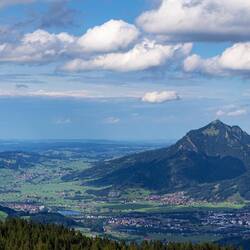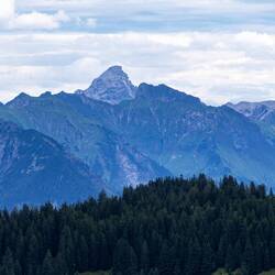 Und dann dachten wir, es wartet der letzte Aufstieg auf uns. Von Grasgehren geht es hoch aufs Riedberger Horn. Ein schöner, relativ angenehm ansteigender Gipfel. Bis oberhalb von Ofterschwang folgen wir nun dem Gratweg über die Hörner. Vom Riedberger Horn geht es den Großen Ochsenkopf, Weiherkopf, Rangiswanger Horn zum Ofterschwanger Horn. Und dazwischen meist immer 100 m rauf und runter. Besonders der Abschnitt zwischen Riedberger Horn und Ochsenkopf hat es in sich. Nicht umsonst weist ein Schild auf alpine Gefahren hin. Teils sind Stuten zu überwinden, wo ich meine Hände an den Fels nehmen muss, um nicht abzuschmieren. Aber die Ausblicke sind einfach traumhaft. Vor allem der Grünten, der Wächter des Allgäus, sticht markant hervor.