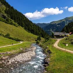 Irgendwie fliegen die Kilometer nur so dahin. Am Berggasthof Einödsbach machen wir eine Pause und gönnen uns einen Germknödel. Ich liebe diese Dinger! 🥰 Und der Blick von der Terrasse auf die Mädelegabel ist genial. Wir müssen aufpassen, dass wir hier nicht einfach sitzen bleiben. Auf dem Weg Richtung Talende passieren wir noch zwei weitere Einkehrmöglichkeiten. An der Schwarzen Hütte lade ich noch zwei kühle Bier in den Rucksack, für das Ziel später. Ab da wird der Weg sportlicher, die Steigungen steiler und die Blicke immer genialer. Je näher ich dem Ziel komme, desto mehr wird mir bewusst, was ich die letzten Wochen geleistet habe. Mich überwältigen immer wieder die Emotionen. Sowas kann man nicht beschreiben, dazu muss man einen so langen Trail mal gemacht haben, glaube ich.