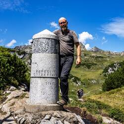 Als ich den Grenzstein 147 erreiche fällt der ganze Druck ab. Es ist vollbracht. Am 02. Mai bin ich mit Laserjupp auf Sylt gestartet und nach 96 Wandertagen und 2 Pausentagen erreiche ich das Ziel. Mein Körper hat mich diese 3.700 km durch ganz Deutschland getragen. Natürlich wird das mit einem Shoey gefeiert. Das Panorama von hier oben ist grandios. Wir genießen es in aller Ruhe und steigen danach nach Österreich ab. Mit dem Bus geht es nach Reutte, von wo wir morgen unsere Heimfahrt antreten.