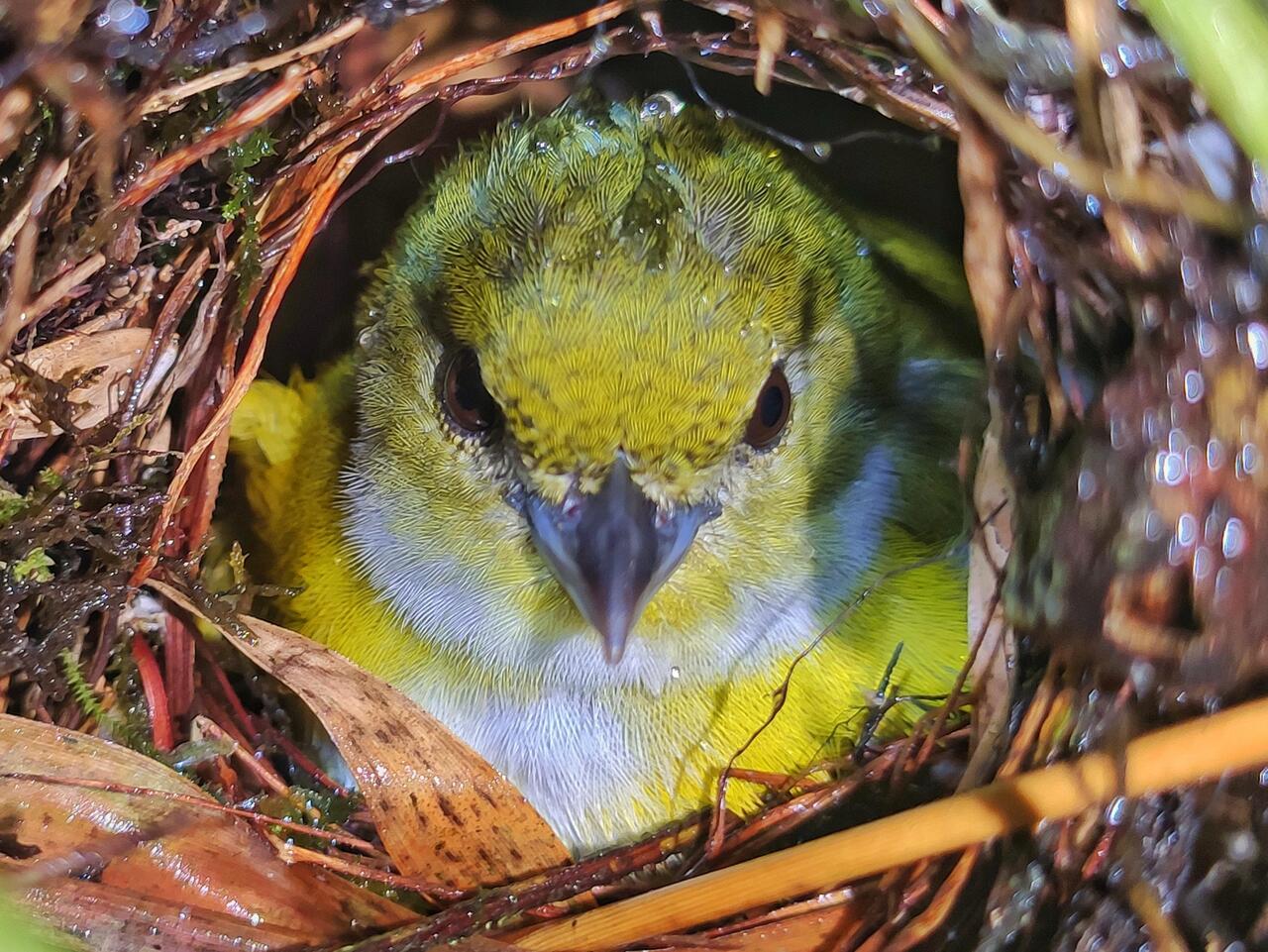 Aquí la hembra de lo que parece ser un Fruterito de Garganta Amarilla en su nido, incubando cinco huevitos e invadida por la tecnología.