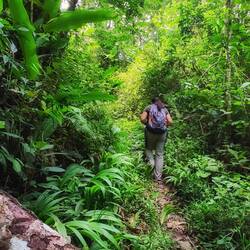 No llevábamos mucho allí cuando tuvimos una visita inesperada. De entre la espesa vegetación apareció de repente un curioso coatí que se nos quedó mirando por unos instantes desprendido de todo temor y apenas a unos 6 o 7 metros de nosotros. Sin dudas no nos miraba tanto a nosotros como a lo que estábamos comiendo, y no dudó en cruzar por las piedras que sobresalían del agua para brincar a nuestra orilla; solo que lo perdimos de vista mientras buscábamos un teléfono para aunque sea hacerle una foto. De todas maneras no se atrevió a acercarse más y parece que se mantuvo merodeando por un rato, o quizás oculto, esperando que nos fuéramos para ver qué quedaba para él. No nos íbamos a ir de allí tan rápido después de haber caminado tanto y menos si puede que volvamos a ver a ese o a otros coatíes más, pues muchas veces suelen andar en grupos numerosos como la gran familia que vimos en Veracruz, México el año pasado. Al rato lo volvimos a ver cruzando el río otra vez y perderse en la selva; esperamos un buen rato más, pero no volvió a aparecer... recogimos nuestras cosas y emprendimos el camino de regreso.