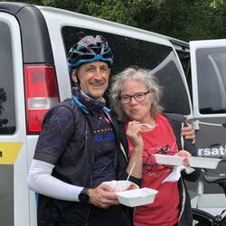 Our accommodations were great at the BW in Springfield. I like the Route 66 thing going on with the old cars and stuff. I really didn’t eat a sit down breakfast, as we were getting the van ready for the day. This motel has the entry to the room right from the parking lot - the old style. I got some yogurt and bagels and cream cheese and we both ate this as we followed the 3 cyclists out of Springfield. The cyclist started your journey from the hotel so we were ready to go when they left just about five minutes behind schedule time. I think it’s very good. 7:05am. About 20 minutes down the road, the Camera had needed to return back to the hotel to get an item. They met up with us again along the way.