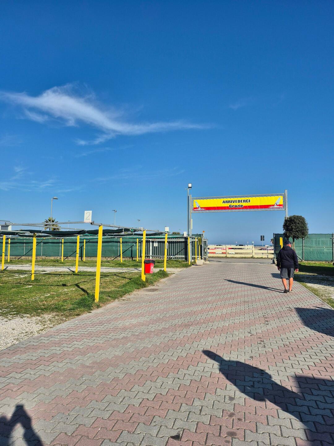Kurzer Gang zum Strand. Super breit. Im Hintergrund sieht man Rimini. Morgen fahren wir mit dem Rad die 8km.